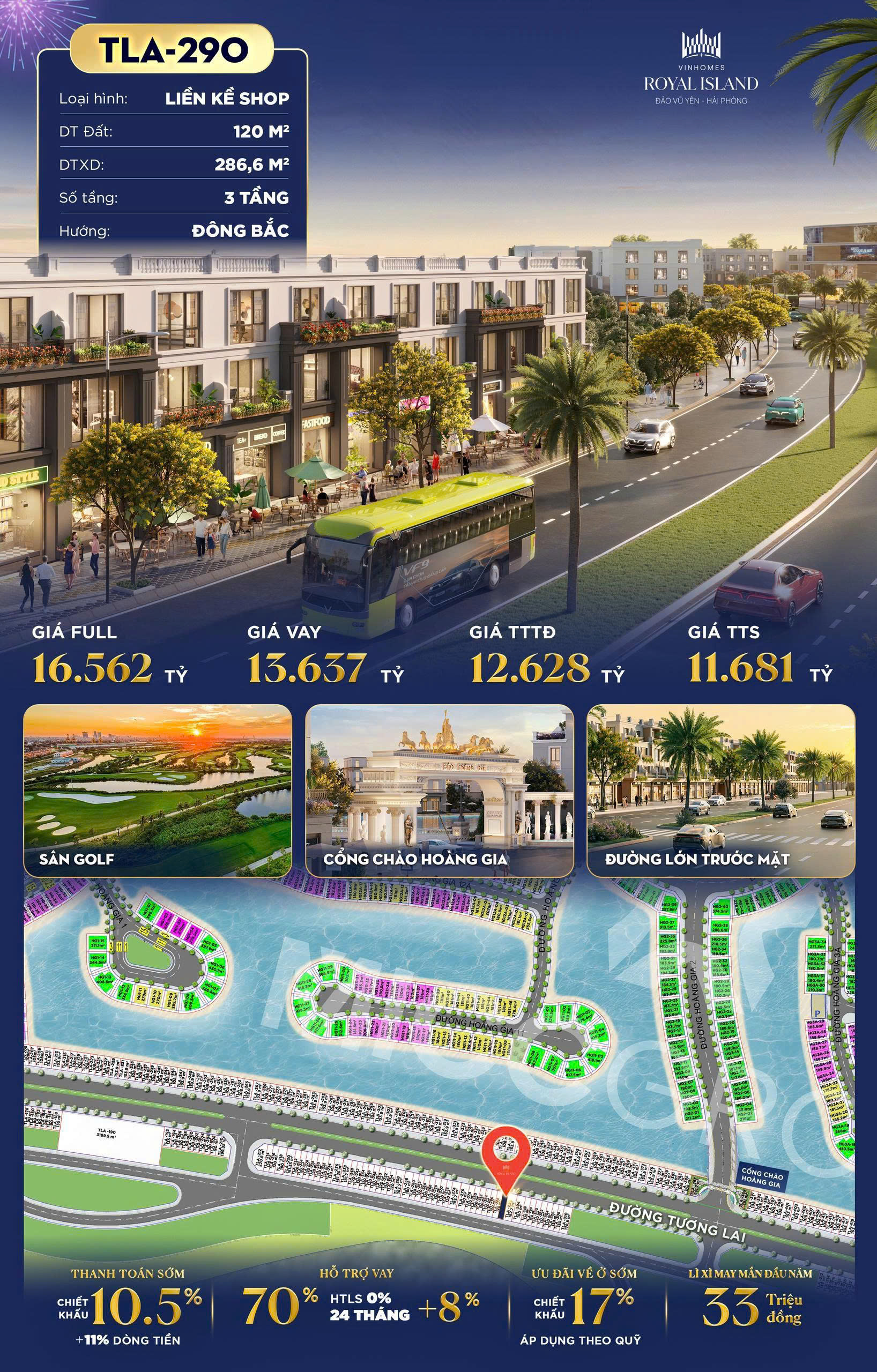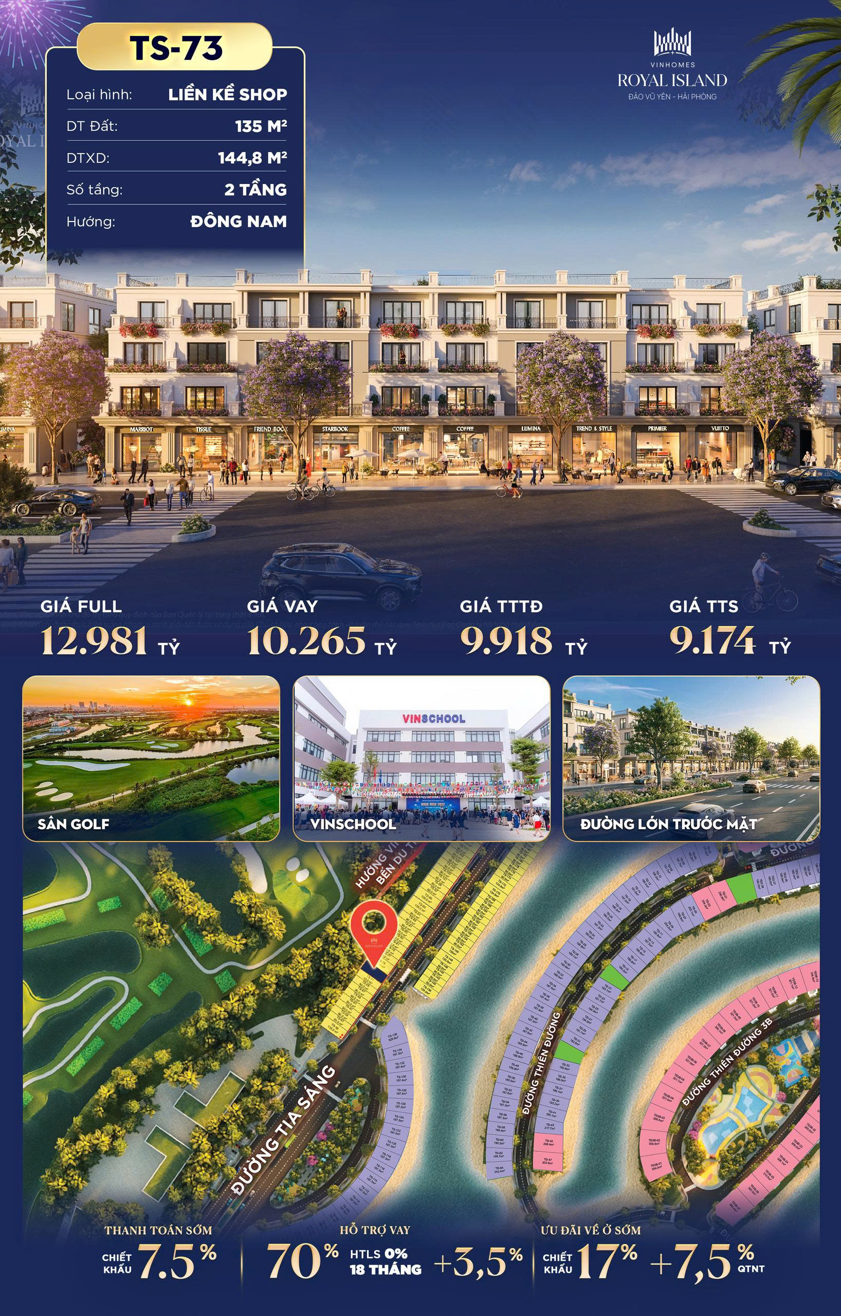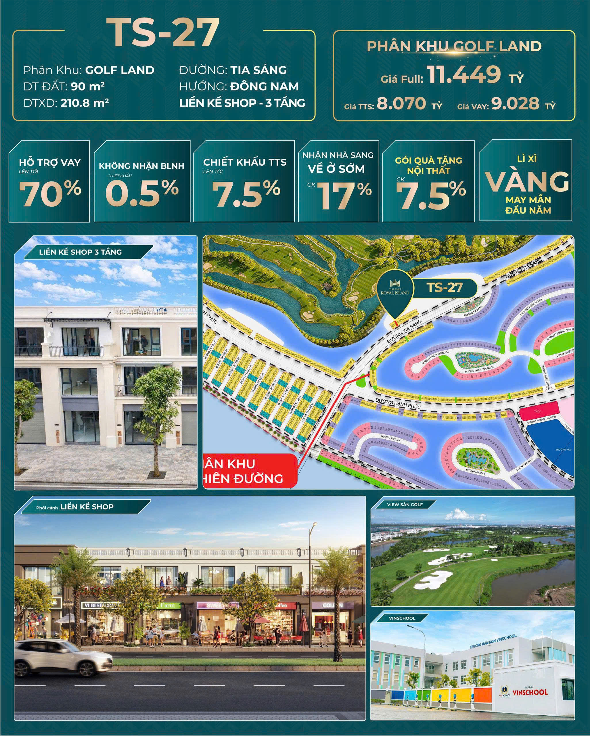 -TS-27 Sở hữu Vị thế Tọa lạc tại cung đường kết nối giữa 2 trục đường xuyên suốt đảo, ngay sát ngã tư sầm uất, đón trọn dòng khách giao thương. Tận hưởng không gian xanh mướt, khoáng đạt của Sân Golf ngay phía sau nhà.